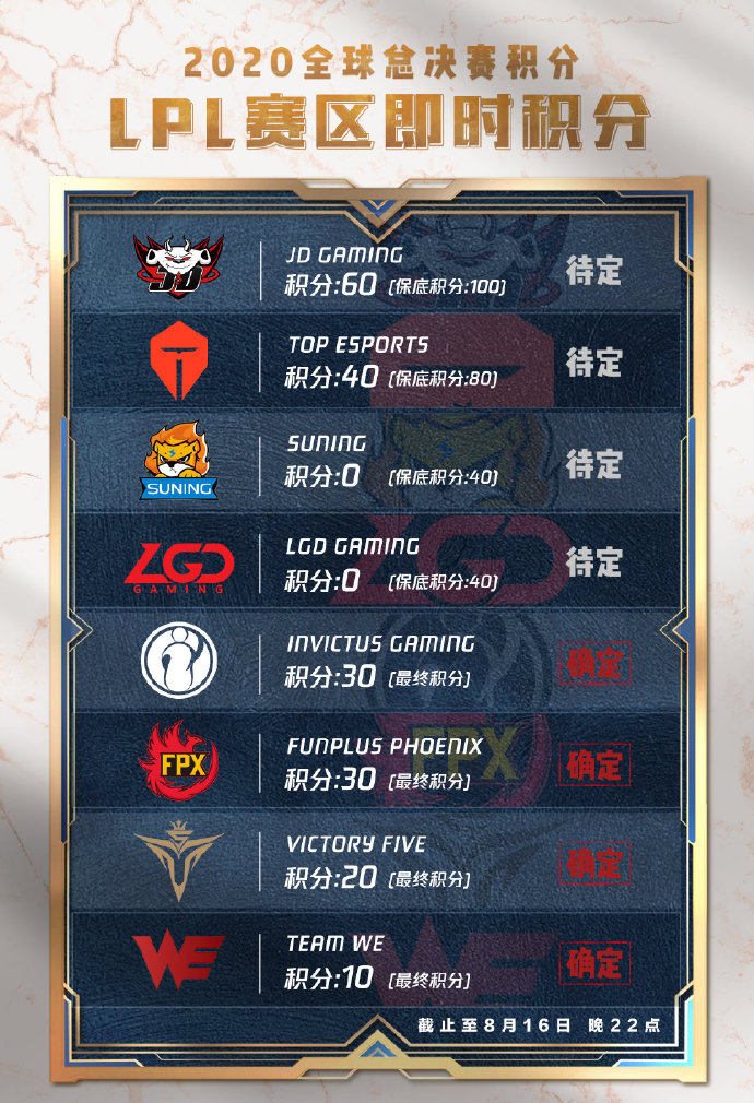 2020全球总决赛LPL赛区晋级形势逐渐明朗,四支代表队将在JDG、TES、SN、LGD、IG、FPX当中诞生