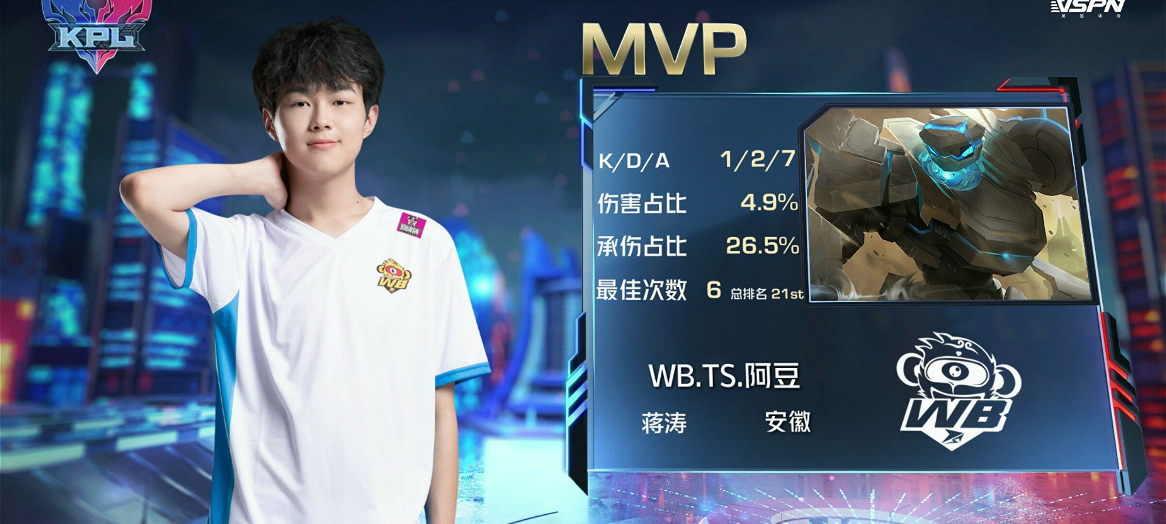 比赛回顾:开局WB. TS打野上路抓人被发现,TES王昭君控住接大招收下一血,接着VG入侵红区,双方爆发团战,VG打出一换二。中期双方团战互有交换,防御塔也各有损失,九分钟WB. TS在上路野区团战,上官婉儿大招秒掉马可波罗,打出零换三破掉中路一塔,入侵野区,经济领先五千多,占据优势。十四分钟WB. TS双龙齐开,破掉所有外塔,开始向高地逼进,主宰刷新后WB TS再次收下,想要破掉高地,但TES五人报团,守住了WB. TS的攻势,也成功守住了高地。二十分钟双方中路进行拉扯,随后爆发团战,WB.TS公孙离二连击破,先打一波零换三,中路兵线也到,登上高地,盾山打断了大乔的回城,团灭对手,直接一波破掉水晶,再下一城。MVP是WB. TS.阿豆的盾山