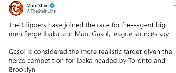据《纽约时报》记者Marc Stein报道,消息人士透露快船加入了对内线伊巴卡和马克-加索尔的争夺战。