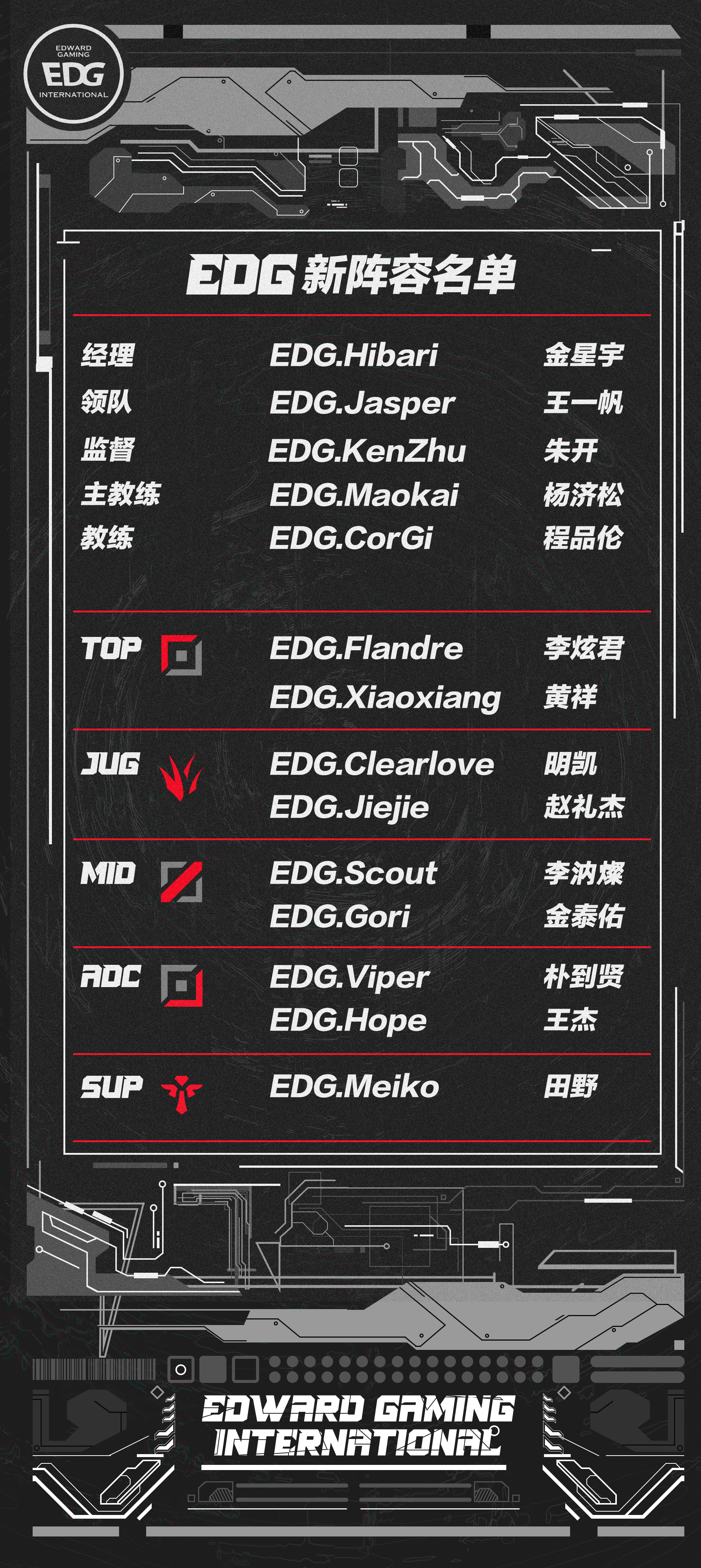 在选手阵容上,EDG对选手阵容进行了大刀阔斧地调整,在不同位置上都引入和保留了强力选手。希望新加入的选手们可以尽快融入EDG大家庭,大家一起努力提升竞技状态,在未来的赛季中打出自己最佳的状态!为了追逐最高的荣誉,