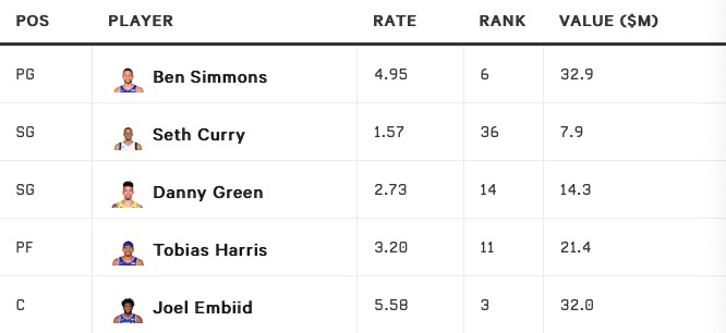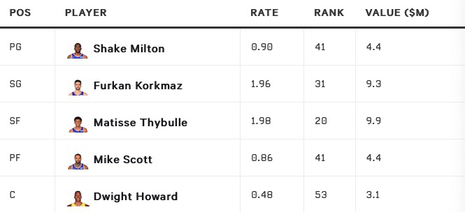 但事实上费城队在进攻端达到的效果与湖人队很接近了,而更令人大跌眼镜的是这只球队的防守从未有外界宣传得那么强悍。最终他们的防守效率值排名全联盟第8,这还不错,但仅仅“不错”是不能让他们带着联盟中游的进攻水准走得更远的。机动性强的球队可以面对费城的双塔时频频制造空位机会,而费城队所拥有溢出的体型优势也没有让人看到闪光点。在最好的情况下,这只球队仍然会是联盟顶级水准,只是这个阵容组合并不会经常在场上。