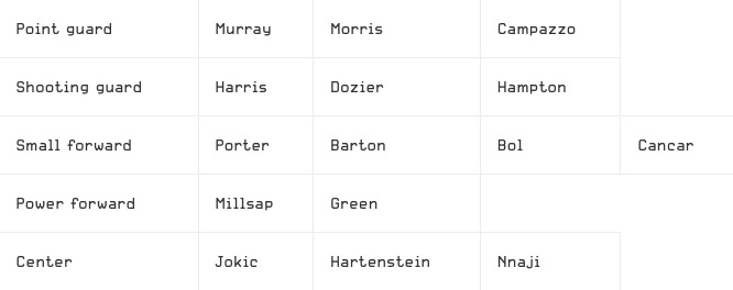 首发阵容很有可能是:控卫贾马尔-默里、分卫加里-哈里斯、小前锋小波特、大前锋保罗-米尔萨普、中锋约基奇。这套阵容并不是一成不变的,威尔-巴顿可能代替小波特出场,新加盟的格林也有可能代替米尔萨普,但是现在暂时还没有这样的迹象。