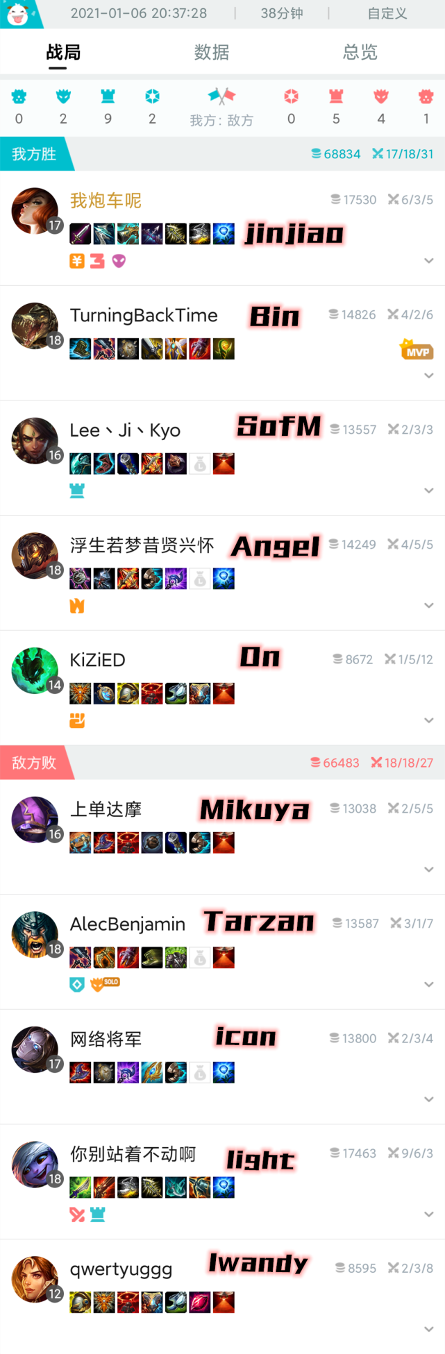 在这局训练赛中,双方出场人员分别为:SN的Bin(鳄鱼)、SofM(豹女)、Angel(维克托)、jinjiao(女枪)、On(锤石);LNG的Mikuya(凯南)、Tarzan(奥拉夫)、icon(发条)、Light(小炮)、lwandy(日女)。双方大战了38分钟,最后由SN取得胜利,Bin斩获MVP。
