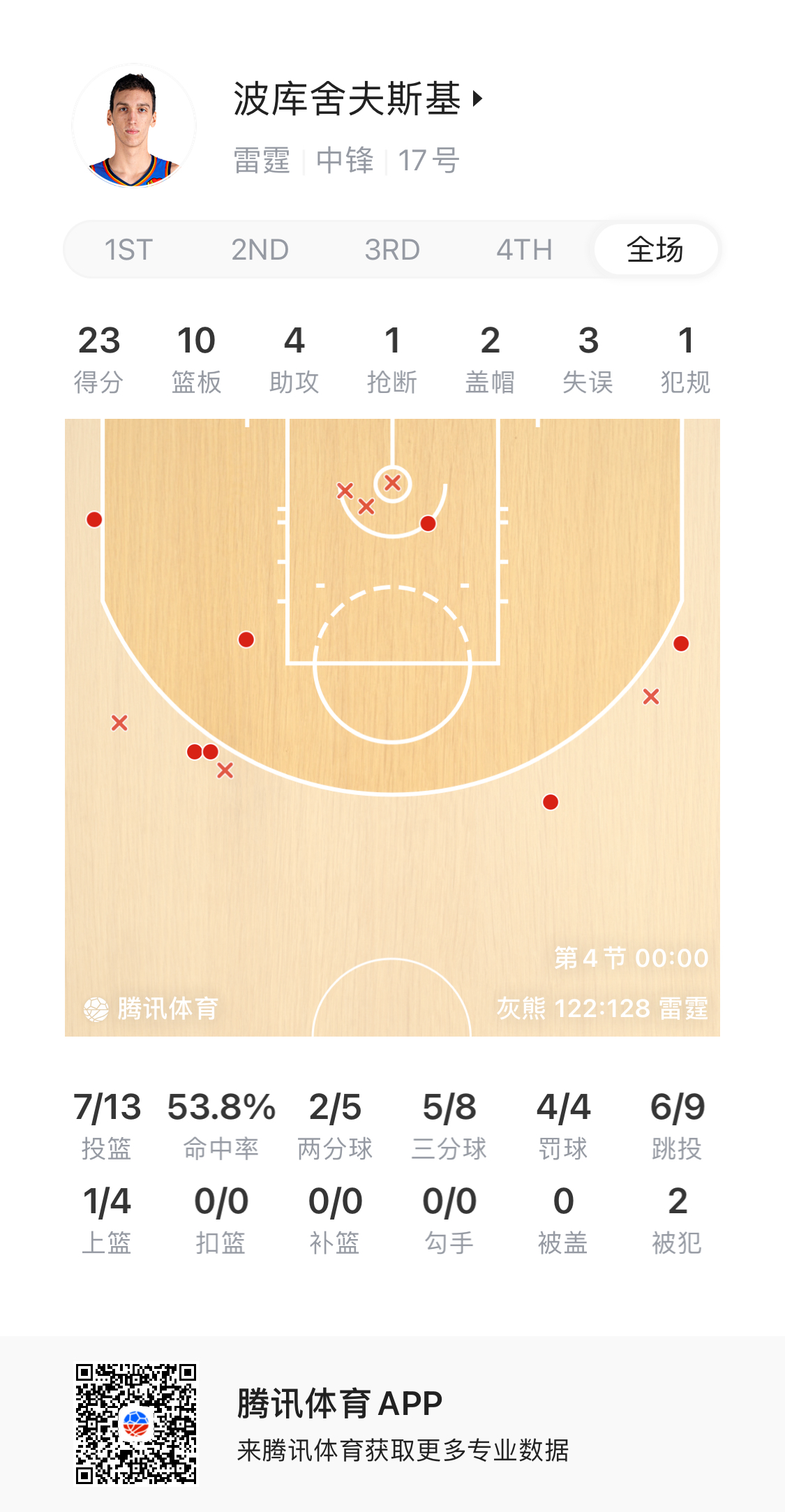 逆转灰熊的比赛,雷霆新秀波库舍夫斯基得到23分10篮板4助攻1抢断2盖帽的数据。