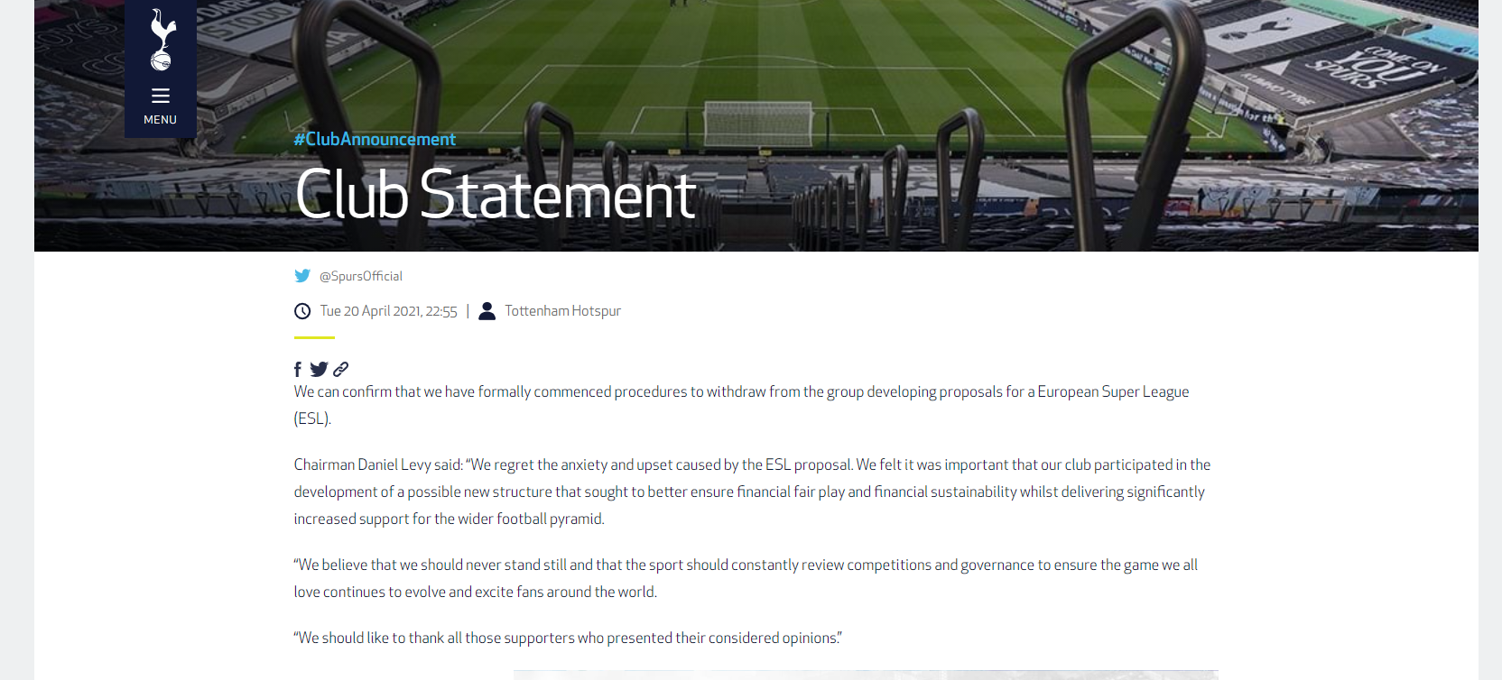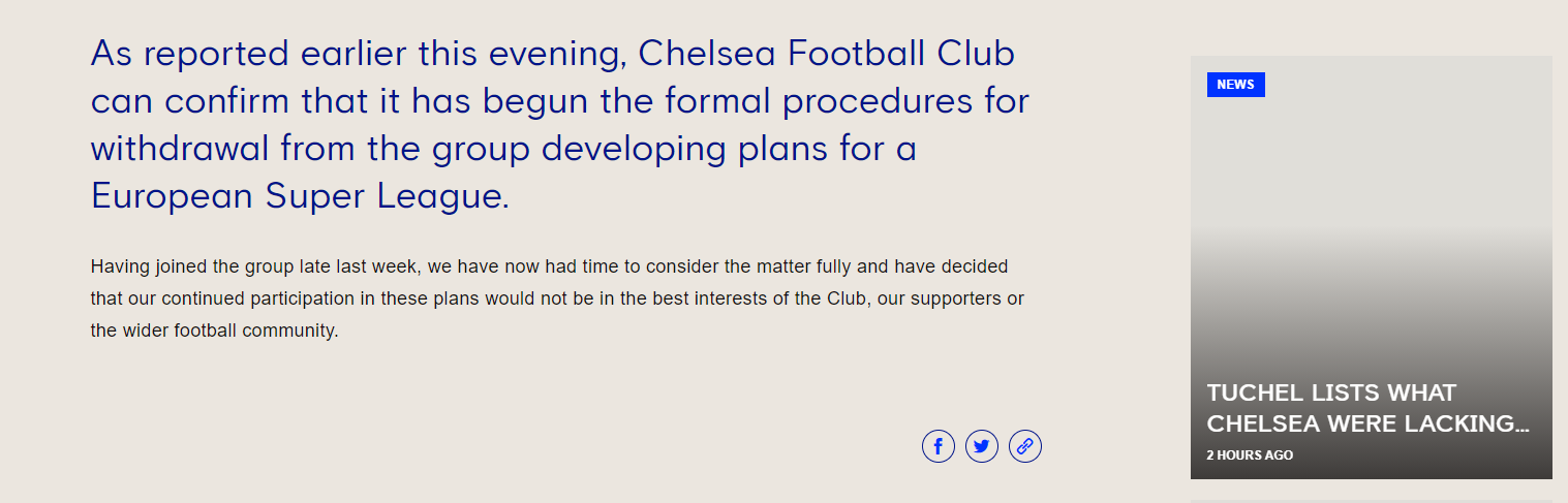 欧超联赛仅仅维持了三天,北京时间今天早上终于看到切尔西的官方也宣布退出欧超联赛,算上切尔西这也六家英超俱乐部全部反水了。
