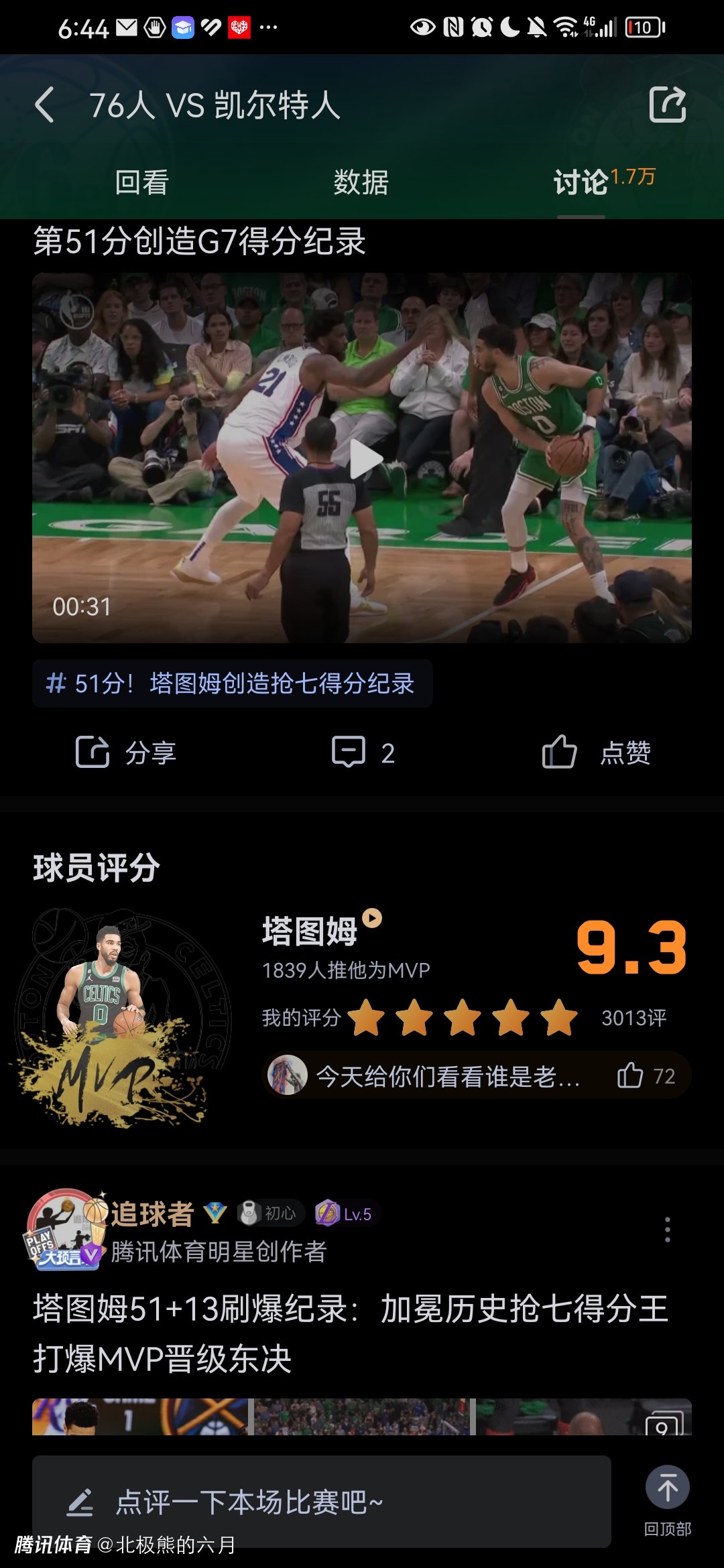 塔图姆风评终于转正了,不知道以后这评分会不会往下掉?今天的表现无愧于联盟新王,不知道巴特勒有没有塔图姆硬,让我们拭目以待。[打脸/][狗头玫瑰][邪魅一笑][星星眼]
