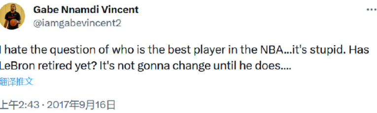 詹密?文森特17年发的推特被挖出:勒布朗退役前都会是联盟最好球员
