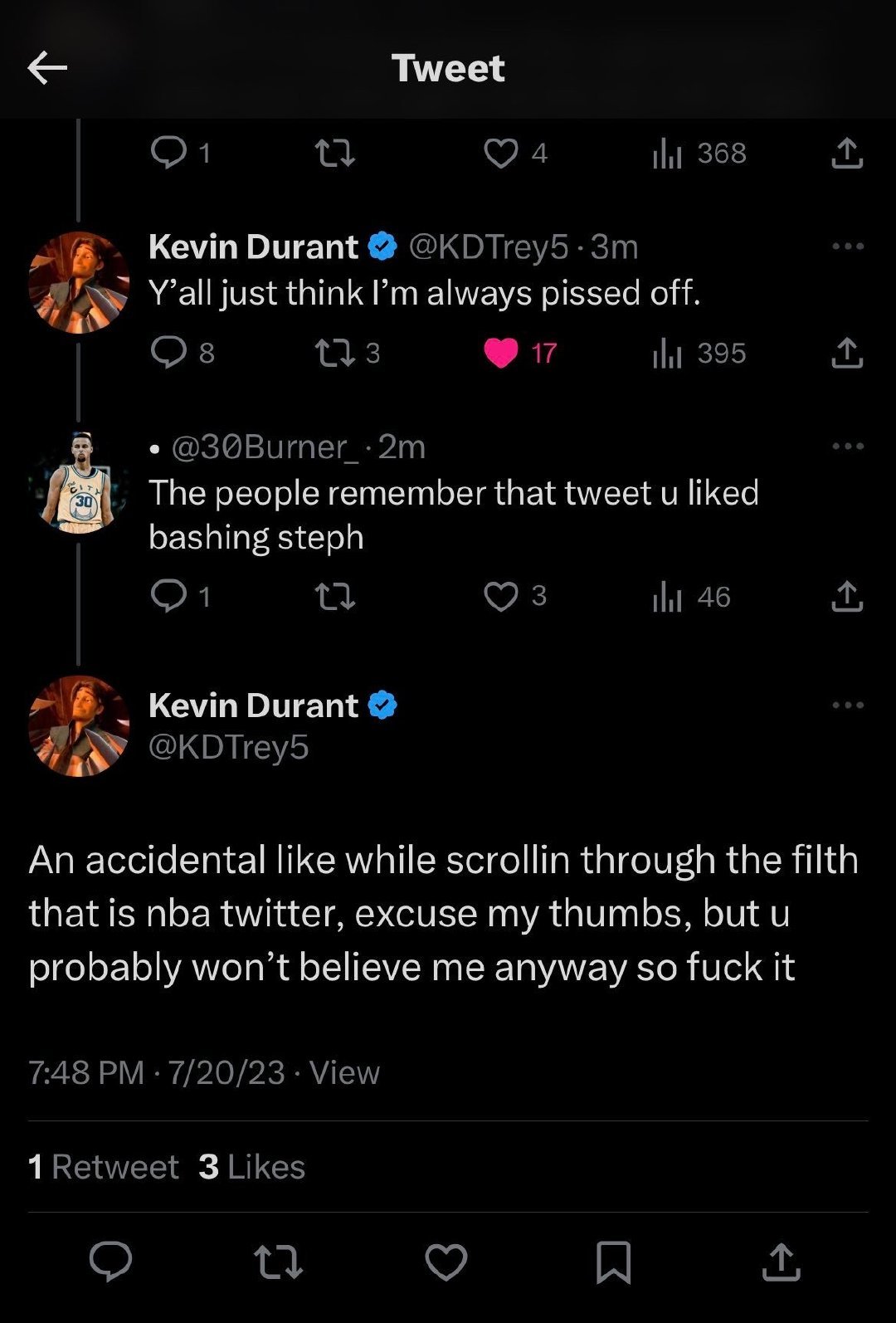 说:“那是意外,往下划的时候点错了,原谅我的大拇指,但你大概不会相信我说的,所以,算了TM的吧!”不过,之后杜兰特删除了这条解释的推文 。 也许您还喜欢:世界杯直播 亚洲杯直播 欧洲杯直播 足球直播