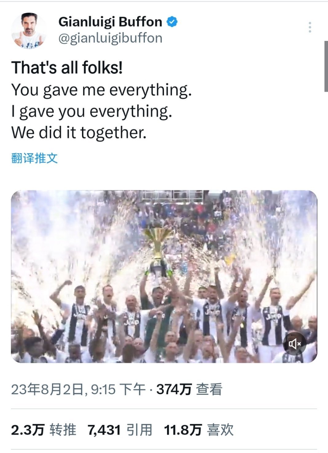 45岁意大利传奇门将布冯在个人社媒正式宣