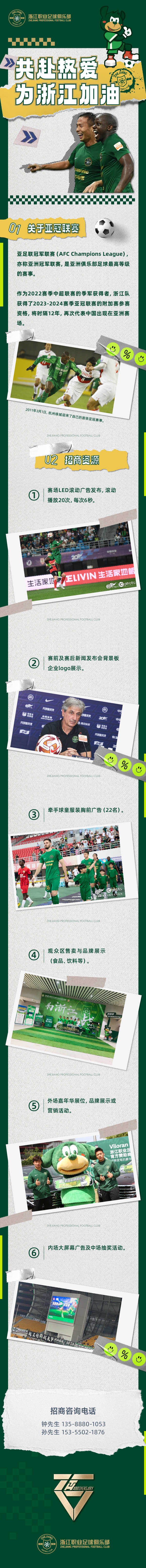 共赴热爱,为浙江加油 8月,与浙江FC一起亮相亚洲赛场 【浙江FC亚冠附加赛招商中】 合作形式:成为浙江职业足球俱乐部官方合作伙伴,在附加赛现场展示企业或产品品牌形象。