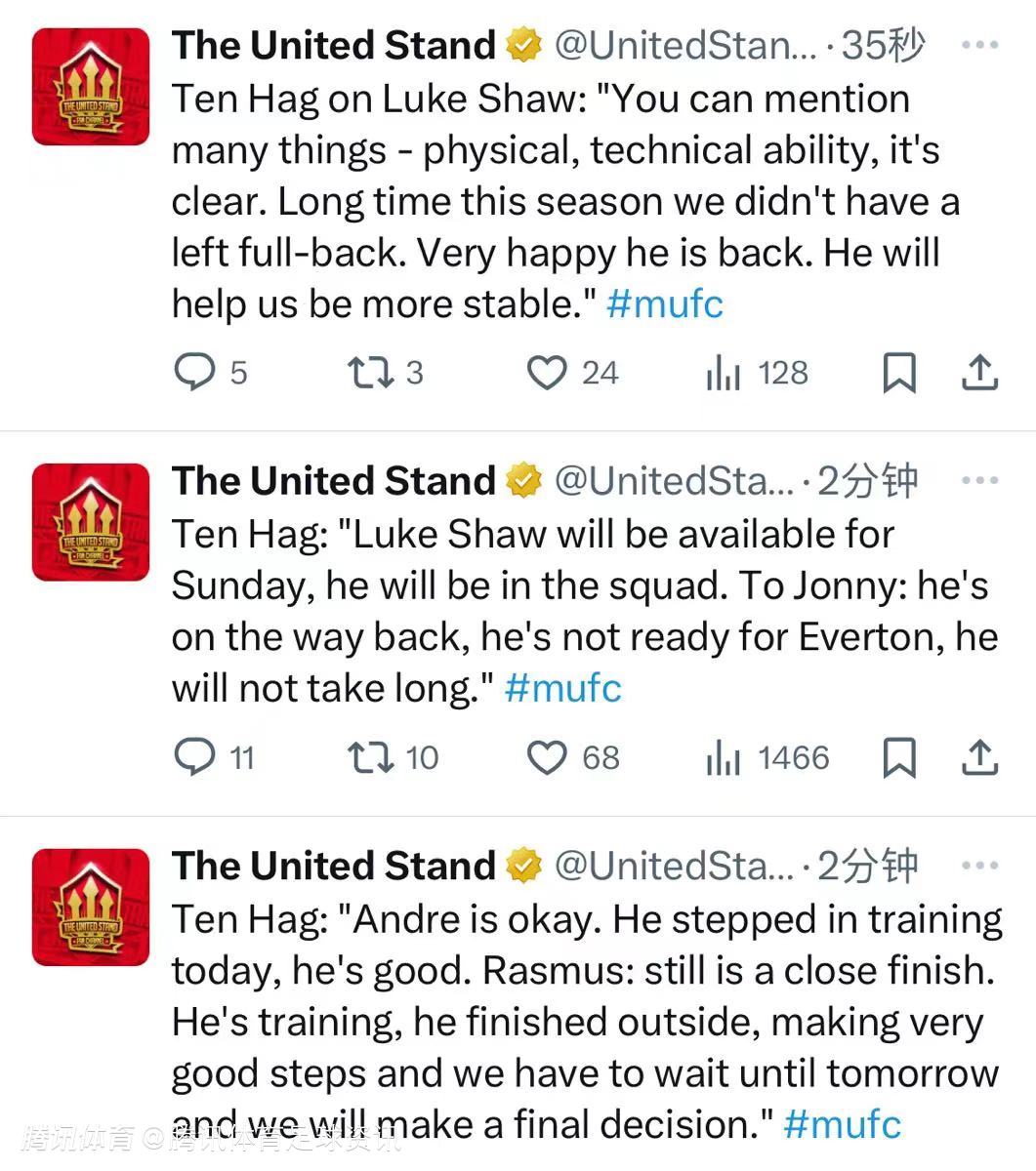 在谈到卢克-肖时,滕哈赫表示:“我们这个赛季已经很久没有左后卫了,?很高兴他回来了,他会帮助我们变得更稳定。”滕哈赫还确认,卢克-肖将出现在曼联周日对阵埃弗顿的比赛大名单中。而球队的另一名伤员强尼-埃文斯,则将继续养伤、无缘大名单,滕哈赫表示:“他已经在回来的路上了,但他还没有为出战埃弗顿做好准备,不过他不会花费很长时间的。”