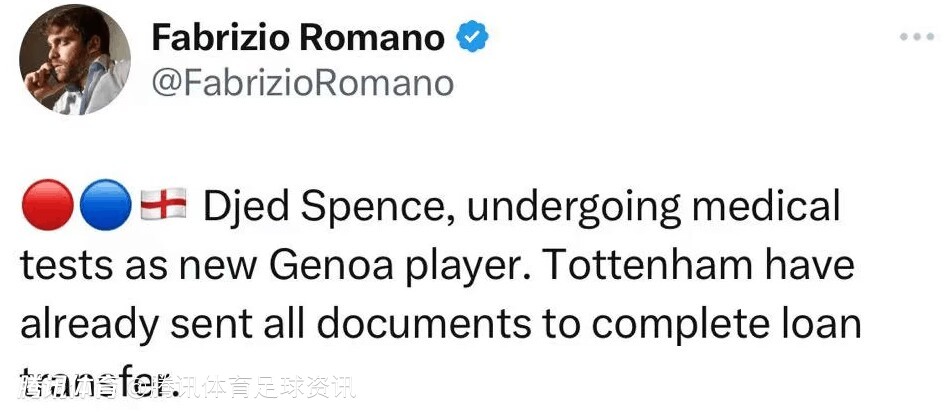 罗马诺表示:“杰德-斯彭斯,作为热那亚的新球员正在接受体检。托特纳姆热刺已经发送了所有的文件来完成租借,斯彭斯租借热那亚的交易包含1000万欧元的买断条款,非强制性。作为德拉古辛交易的一部分,热刺将支付斯彭斯100%的工资待遇。”
